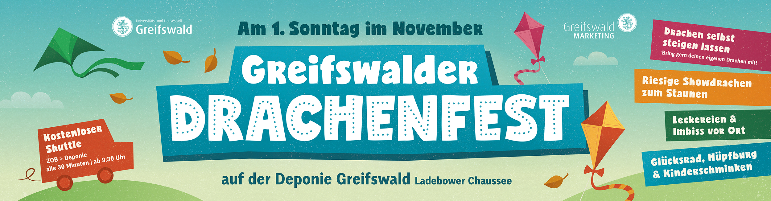 Wenn sich der Herbst von seiner grauen Seite zeigt, bringen wir Farbe ins Spiel: Am Sonntag, den 02. November 2025, verwandelt sich der Deponieberg in ein lebendiges Drachenparadies. Von 10 - 16 Uhr tanzen bunte Schmetterlinge, riesige Pinguine und fantasievolle Oktopusse durch die Lüfte und sorgen für ein spektakuläres Panorama über Greifswald.