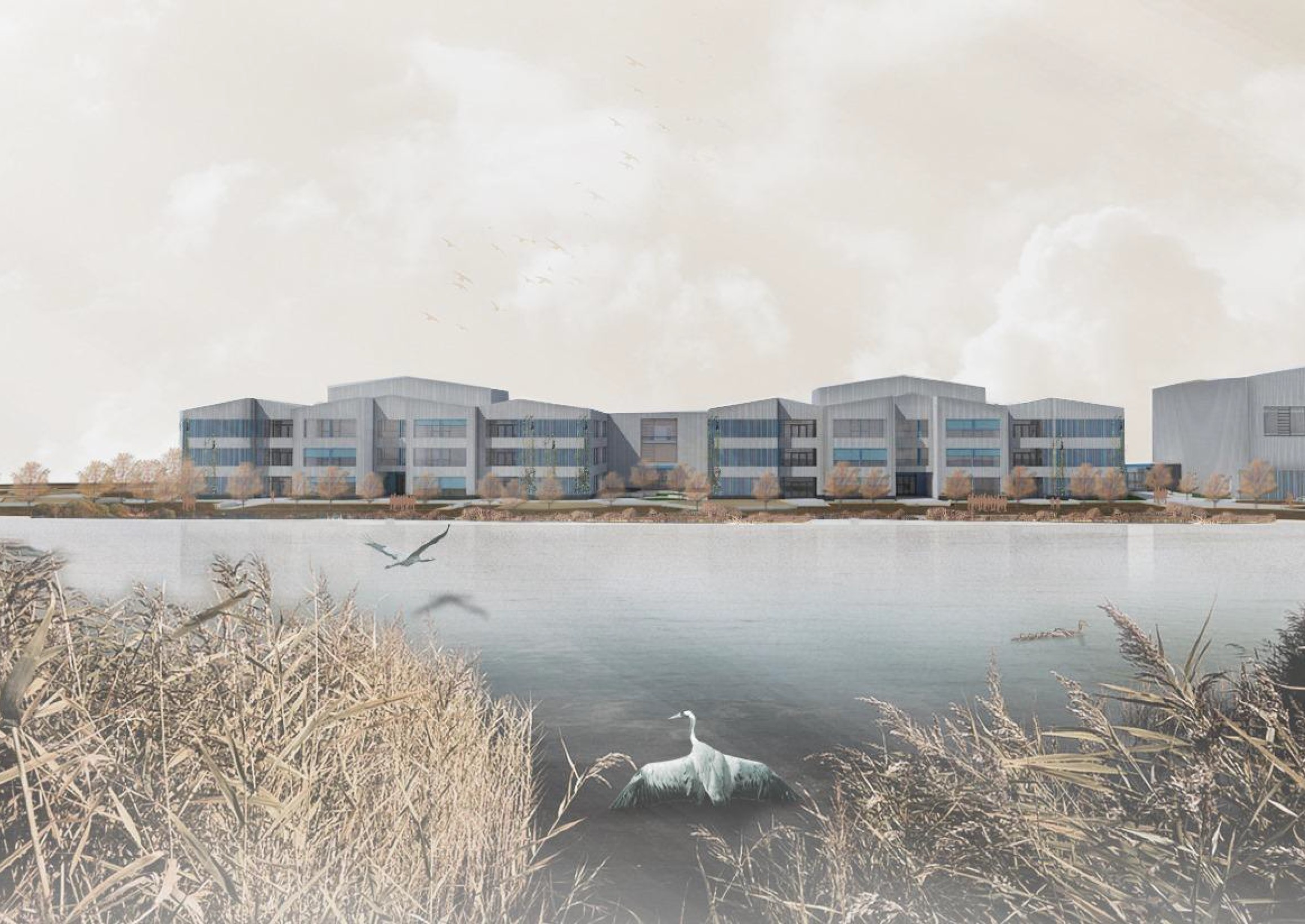 Das Grundstück ist nahezu vollständig von Wasserflächen umgeben und in seiner Größe begrenzt. Hieraus ergeben sich hohe Planungsbedarfe an die Baustellenlogistik und die Unterbringung aller räumlichen Funktionen.