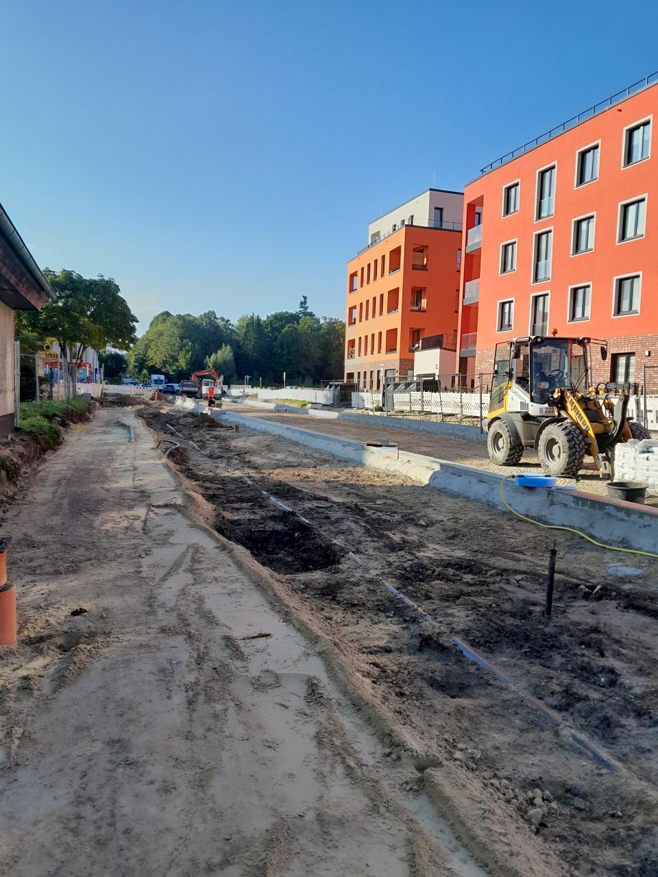 Im 1. Bauabschnitt wurden alle Borde und Rinnen fertiggestellt. Der Asphalt wurde eingebaut. Die Pflasterarbeiten auf den Gehwegen werden fortgesetzt.
