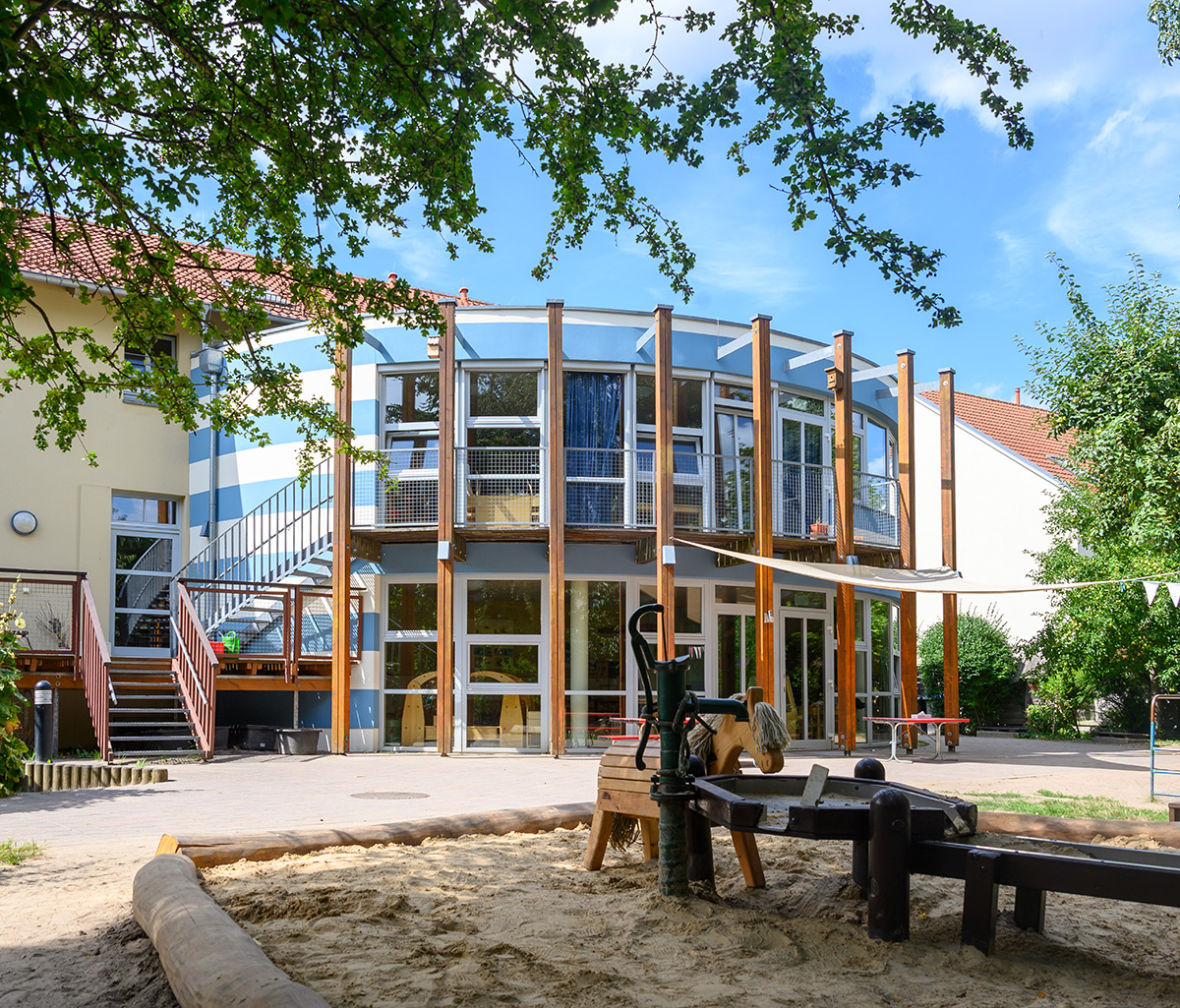 Auf mehr als 700 m², aufgeteilt auf zwei Etagen, finden die Kinder moderne, lichtdurchflutete und kindgerecht gestaltete Räumlichkeiten, darunter eine Mensa mit Kinderküche, einen Kletterraum sowie ein Atelier. Auf dem wunderschön gestalteten Hofgelände können die 62 in der Einrichtung betreuten Kinder nach Herzenslust toben und die Umwelt entdecken. Seit August 2016 werden die Kinder von einem Hauskoch verpflegt, der mit frischen regionalen und gesunden Produkten bei den Kleinen punktet.