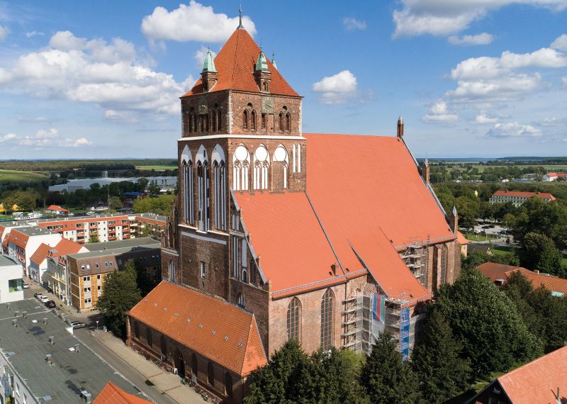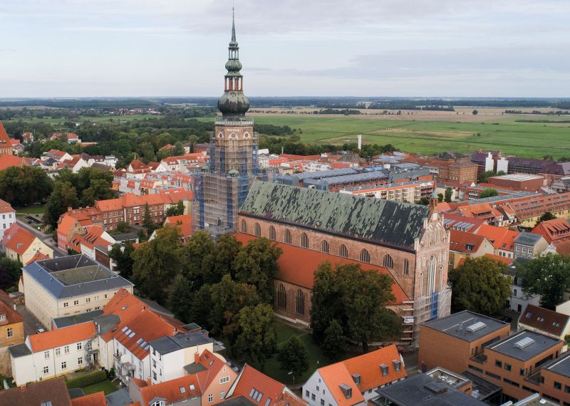 Der Bau wurde in der 2. Hälfte des 13. Jh. begonnen und als eine der größten Hallenkirchen der norddeutschen Backsteingotik 1330 vollendet. Die „Dicke Marie“ wirkt mit ihrem Ostgiebel und der gedrungenen Kubatur sympathisch stadtbildprägend. Hervorzuheben ist auch die südlich angebaute Annenkapelle, die als Winterkirche genutzt wird.