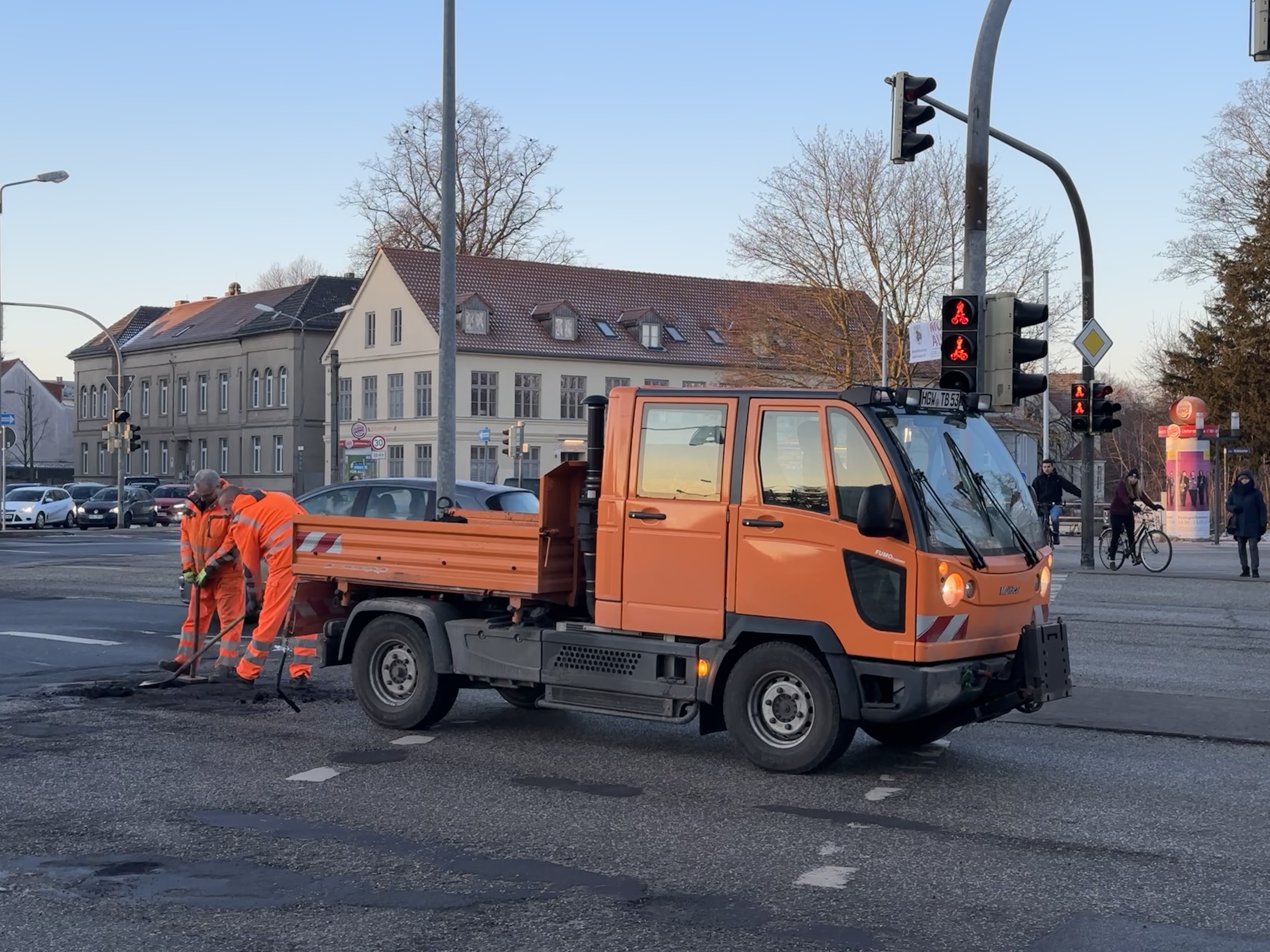 Die lange Frostperiode macht auch den Greifswalder Straßen zu schaffen. Seit dem 15. Januar sind die Teams des städtischen Bauhofs verstärkt im Einsatz, um witterungsbedingte Schäden auf den Hauptverkehrsstraßen im Stadtgebiet schrittweise zu beheben, so es die Wetterlage zulässt. Bisher wurden bereits rund 10 Tonnen Reparaturasphalt verarbeitet.