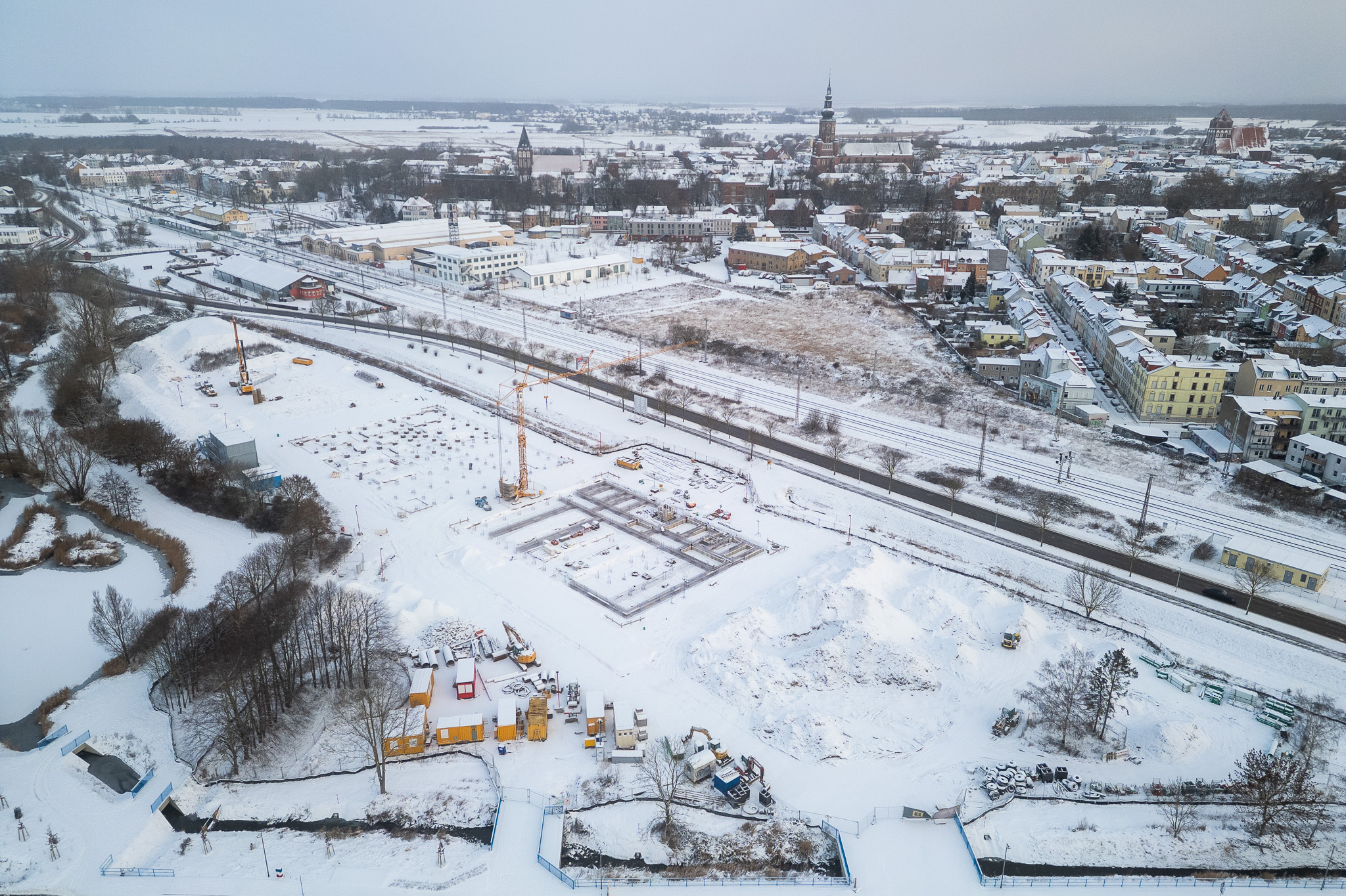 Als nächstes werden die Baugründe für die Regionalschule, Grundschule sowie Mensa und Sporthalle vorbereitet. Hierfür erfolgen bereits die ersten Bewehrungarbeiten. Zur weiteren Verstärkung wird die Bewehrung der Pfahlköpfe freigestemmt, um diese in die Balkenroste und die Bodenplatte mit einzubinden. Sobald die Witterung es zulässt, werden innerhalb der Gebäude die Grundleitungen für sämtliche Medien wie Wasser, Abwasser und Strom verlegt. Parallel dazu wird der belastete Mutterboden zur Nachbehandlung auf ein anderes städtisches Grundstück umgelagert und verwertet.