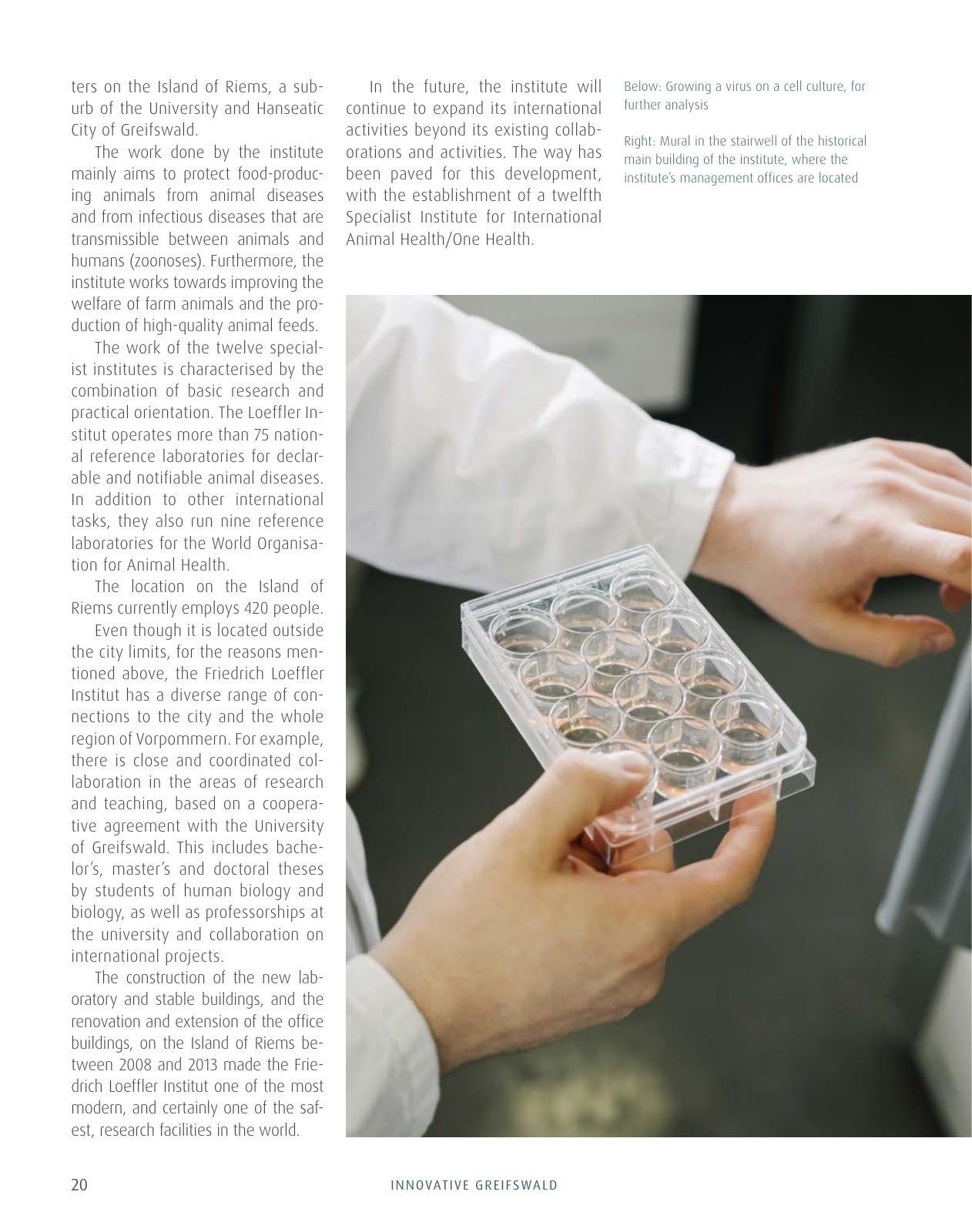 INNOVATIVE GRE IFSWALD 20 ters on the Island of Riems a sub urb of the University and Hanseatic City of Greifswald The work done by the institute mainly aims to protect food produc ing animals from animal diseases and from infectious diseases that are transmissible between animals and humans zoonoses Furthermore the institute works towards improving the welfare of farm animals and the pro duction of high quality animal feeds The work of the twelve special ist institutes is characterised by the combination of basic research and practical orientation The Loeffler In stitut operates more than 75 nation al reference laboratories for declar able and notifiable animal diseases In addition to other international tasks they also run nine reference laboratories for the World Organisa tion for Animal Health The location on the Island of Riems currently employs 420 people Even though it is located outside the city limits for the reasons men tioned above the Friedrich Loeffler Institut has a diverse range of con nections to the city and the whole region of Vorpommern For example there is close and coordinated col laboration in the areas of research and teaching based on a coopera tive agreement with the University of Greifswald This includes bache lor s master s and doctoral theses by students of human biology and biology as well as professorships at the university and collaboration on international projects The construction of the new lab oratory and stable buildings and the renovation and extension of the office buildings on the Island of Riems be tween 2008 and 2013 made the Frie drich Loeffler Institut one of the most modern and certainly one of the saf est research facilities in the world In the future the institute will continue to expand its international activities beyond its existing collab orations and activities The way has been paved for this development with the establishment of a twelfth Specialist Institute for International Animal Health One Health Below Growing a virus on a cell culture for further analysis Right Mural in the stairwell of the historical main building of the institute where the institute s management offices are located